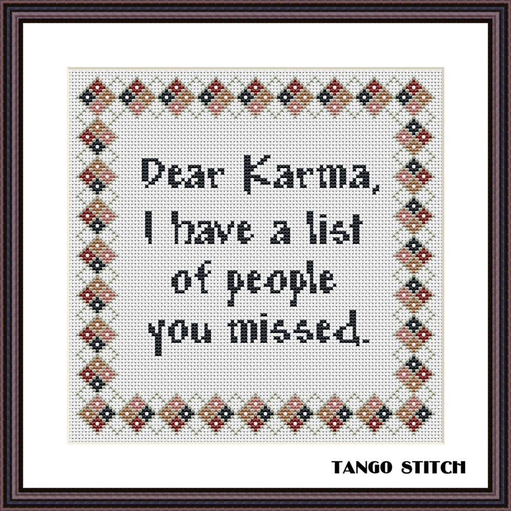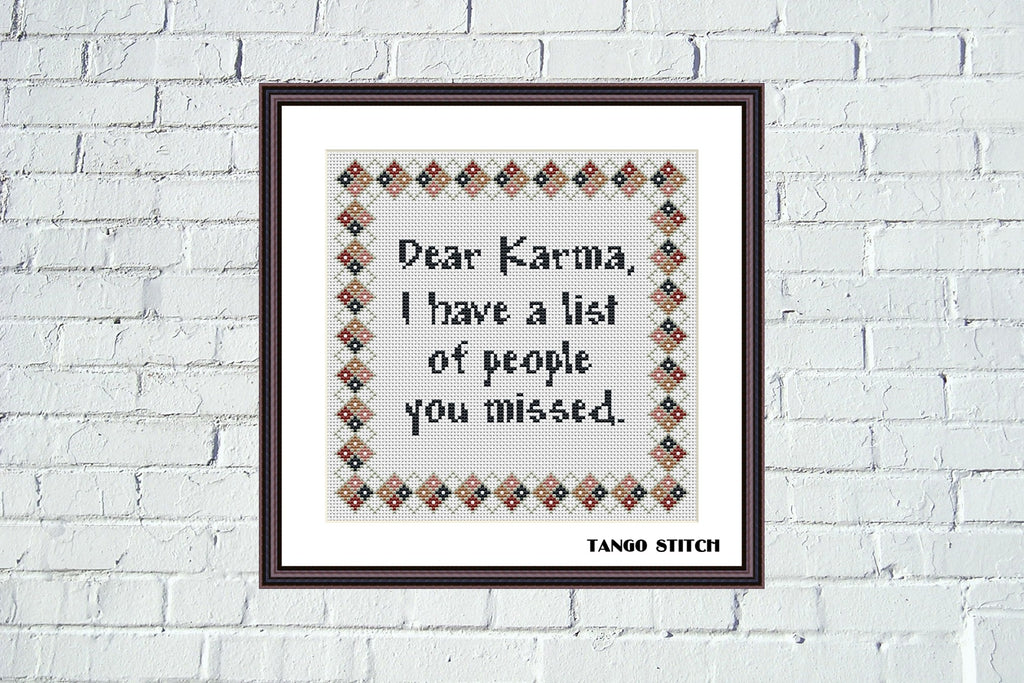 Dear Karma I have a list of people you missed funny cross stitch pattern, Tango Stitch